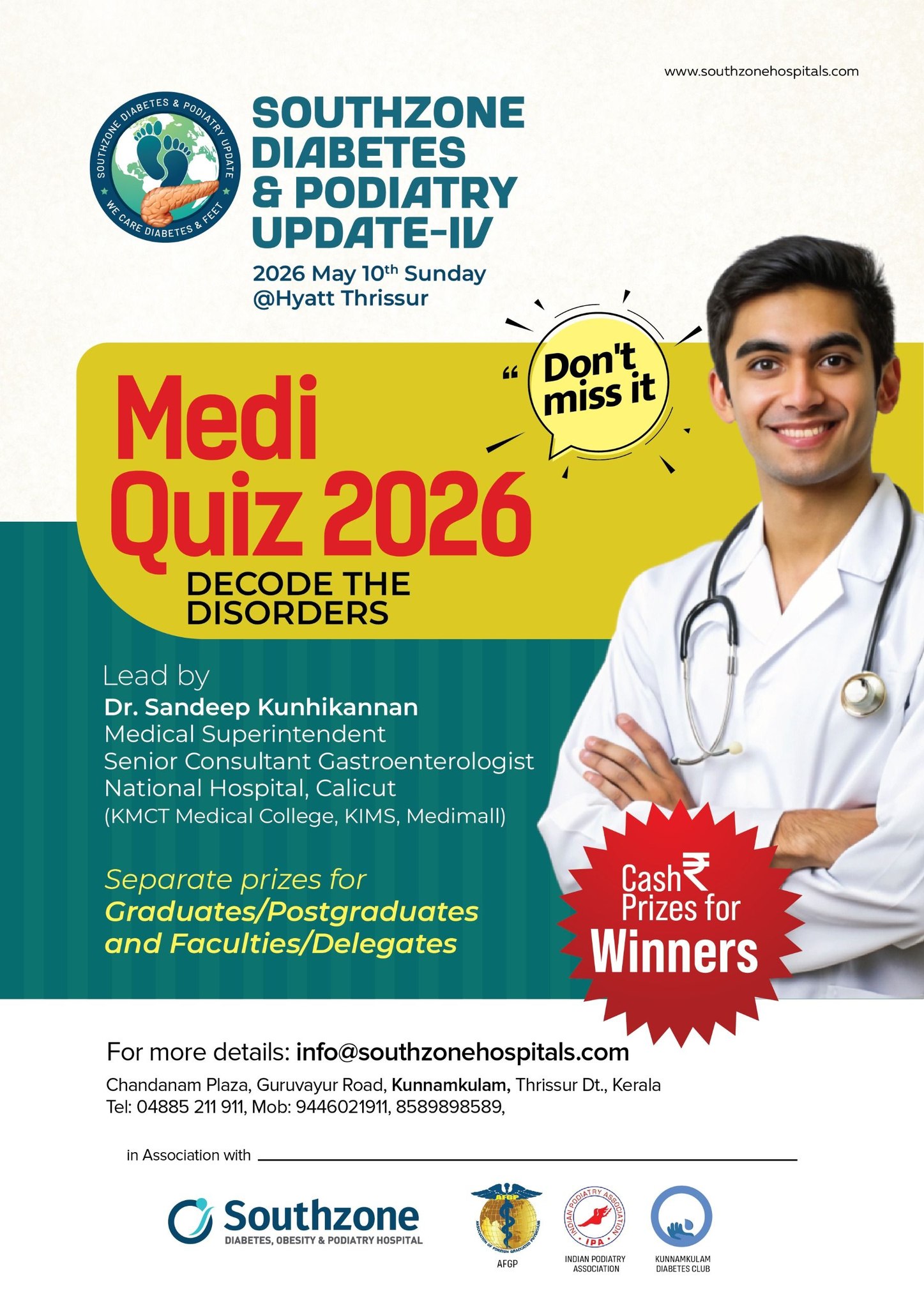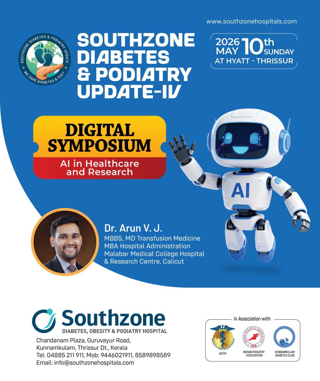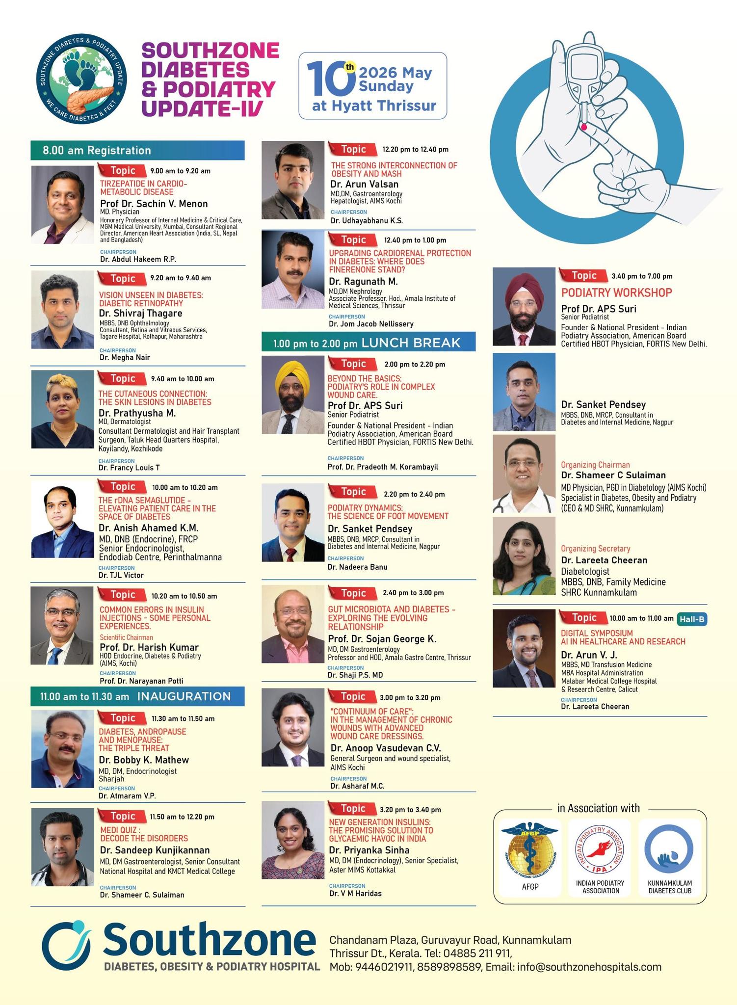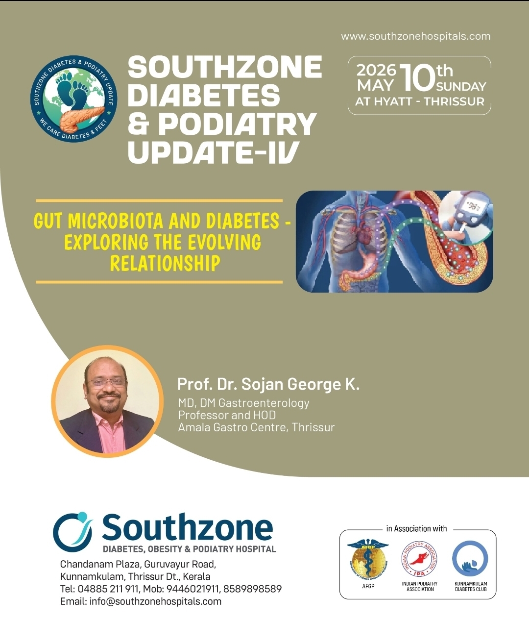 SouthZone Hospital & Research Centre Pvt. Ltd. founded by Dr.Shameer C Sulaiman is a comprehensive speciality centre for diabetes care which is operational from May 2009 in Kunnamkulam, Thrissur district Kerala, India. Inaugurated by Prof & HOD. Department of Endocrinology & Diabetes Dr. HARISH KUMAR AIMS. KOCHI. We introduced for the first time in the area, a structured and all-encompassing diabetes detection and care programme in one centre. The centre offers facilities from head to foot evaluation of diabetes patients.